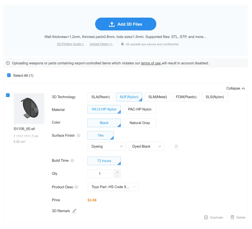 さて実際の発注方法ですが、特に難しいことはありません。JLC3DPの発注ページから先ほどのSTLファイルをアップロードして、印刷方式や材質、色などを選択するだけです。