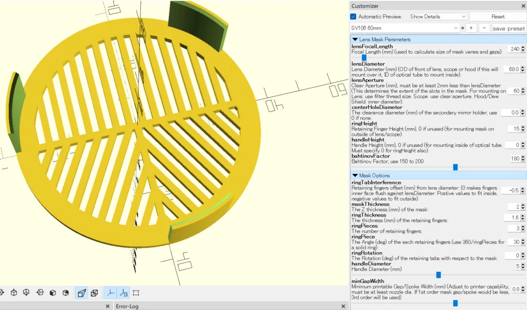 この度SV106 60mmとSV165 40mm用のバーティノフマスクを3Dプリントで作ったので、その方法をご紹介します。CAD知識なしで自分の望遠鏡用のバーティノフマスクの3Dプリント用データを作れます。