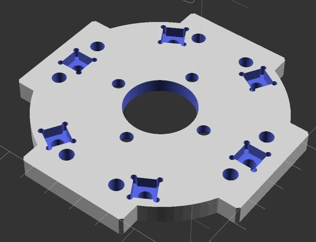 裏面はこんな感じ。今のところ、ハーモニックドライブの固定ボルトにはそこそこトルクを掛けたいなと思っていて、裏面にM4の鉄製四角ナットをはめ込めるように作ってみています。アルミのネジ穴の強度をあまり信用できないと思っているためです…