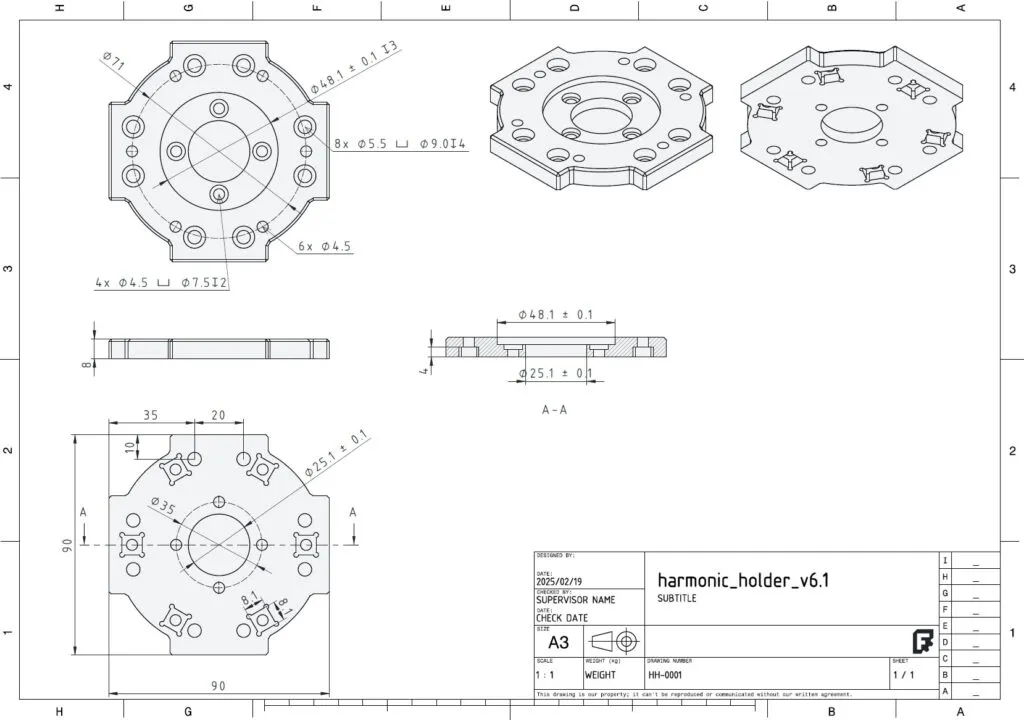ハーモニックドライブをはめるΦ48の窪みと、プラネタリギアボックスをはめるΦ25の穴だけ±0.1mmの公差を入れています。JLCCNCだと、指定できる一番厳しい公差が±0.05mmまでです。±0.05mmにするとかなり高くなるが±0.1mmだとあまり変わらなかったので、穴寸法を+0.1mmしたうえで±0.1mmの公差を入れる感じにしました。